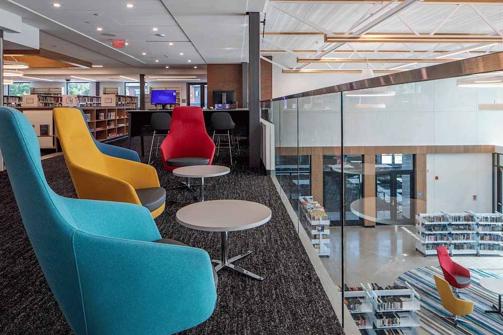 The new Westfield Washington Public Library features a transformative railing system designed and installed through a collaboration between krM Architecture and Spohn Associates, both of Indianapolis, and Hollaender Manufacturing Co. of Cincinnati, Ohio.